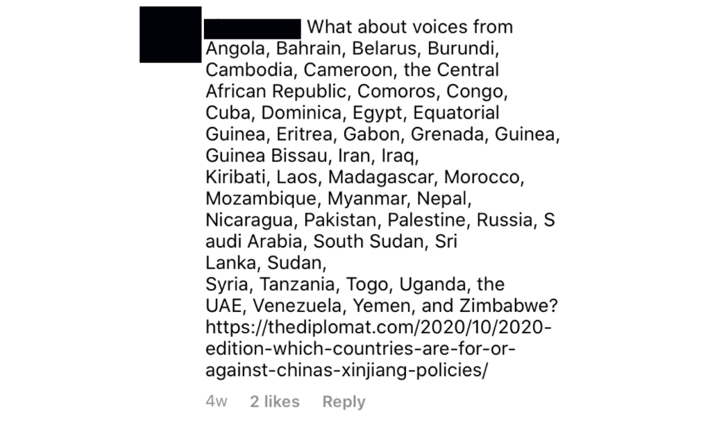 The awareness post has now been re-published without the last slide and with additional links to sources. Still, some commenters question why only Western voices are disclosed in the post and why it focuses on all the nations who have condemned China’s treatment of the Uyghurs even though some countries have defended China’s human rights records and signed a UN document in which they support China’s policies in Xinjiang. Countries in support of China include Algeria, Egypt, United Arab Emirates and Russia.
