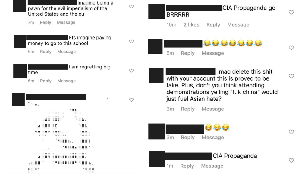 The original post was soon removed. The main issue seemed to be the last slide of the post, which encouraged students to help by boycotting all companies associated with Uyghur labour and to join protests. The commenters disapproved of the slide, as they argued that it motivated people to sabotage companies and facilities without doing their own research, as well as potentially contributing to “fuel Asian hate,” as one person wrote.