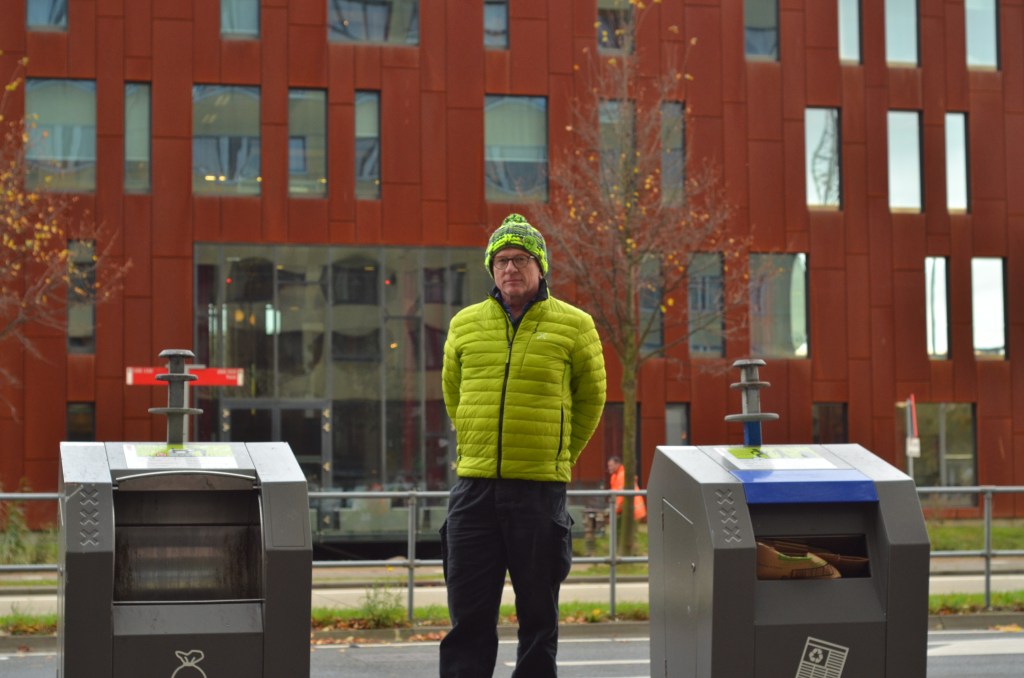 On a Sunday afternoon, Maximiliaan Braakman, 62 years old and a resident of Carolina Macgillavrylaan, sets out to check on the underground trash bins throughout his street. An overcast sky reminds him it’s November, but the cold, drizzly weather doesn’t deter him. His reflective green jacket and beanie keep him warm and depict his trademark logo: a green gorilla.