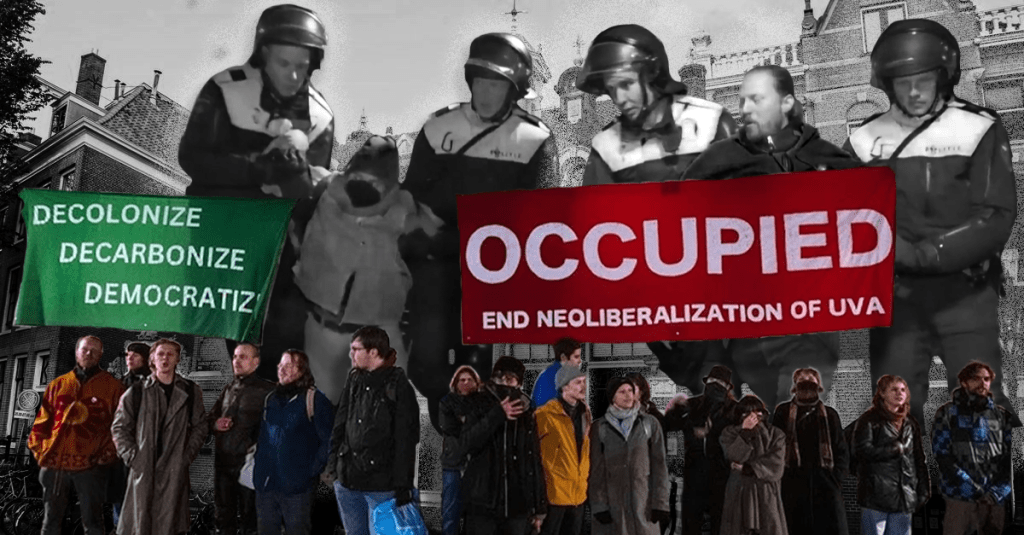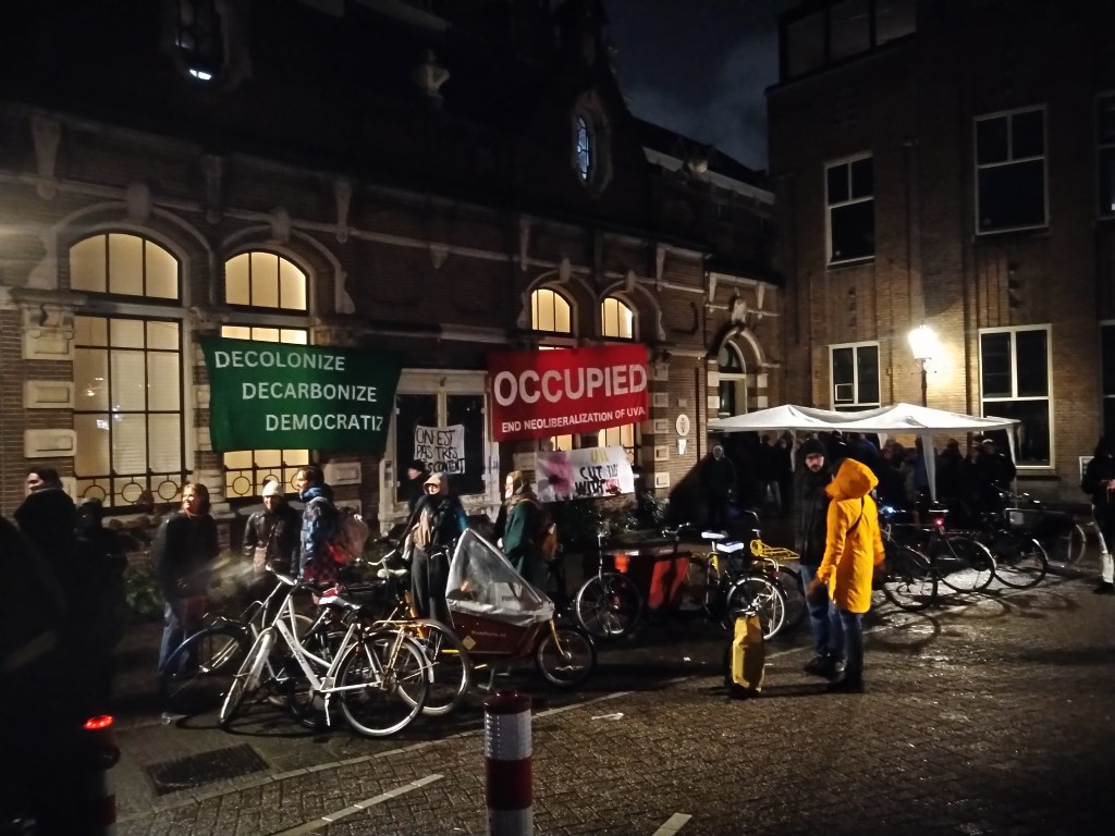 “Decolonize, Decarbonize, Democratize”: It was under this slogan that a group of approximately 200 protesters had left the Roeterseiland campus earlier that day. Organised by several student-led groups – among them UvA Rebellion, the Decolonization Club, Student Justice Palestine, and the Activistenpartij UvA – they protested against “corporate greed” and urged that the “university cut ties with climate criminals,” among others.