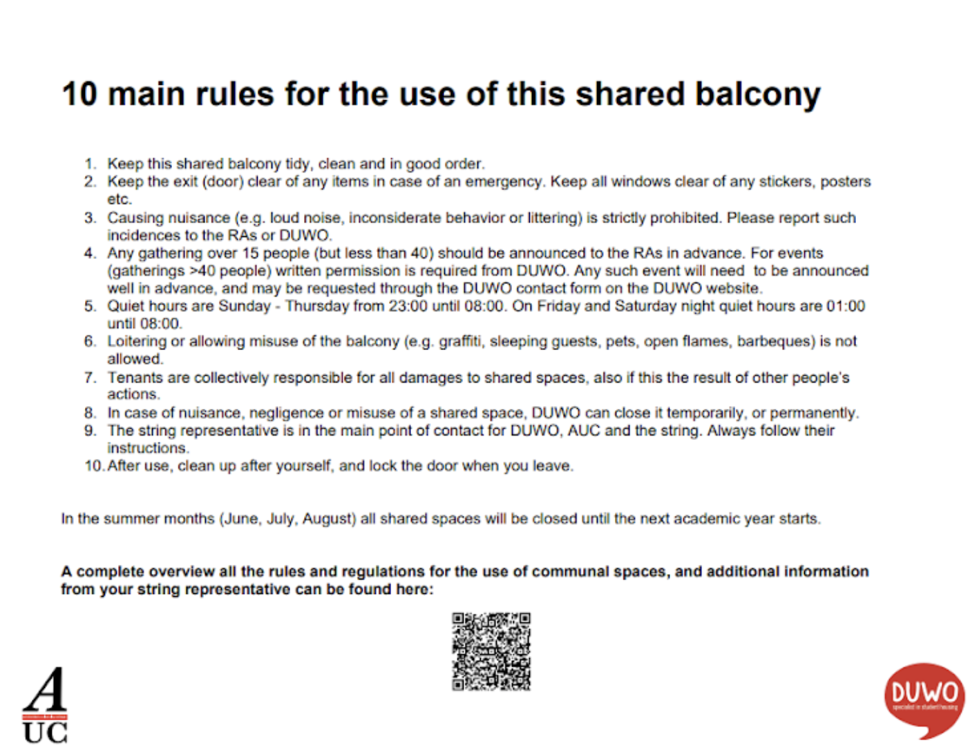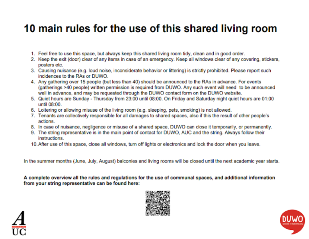 On 29 December 2022, a DUWO newsletter was sent to all students in the dorms explaining that rules have been drawn up regarding the usage of living rooms and balconies. These rules can be found on the windows of these spaces (see below). Many of the rules are not new, but DUWO will now be enforcing them more strictly. Common rooms will now be referred to as living rooms by DUWO and are mainly meant to be used by the tenants of a string as an extension of their room, rather than solely for parties and other events. In strings that do not have a string representative, the shared areas have been closed until the start of the next academic year.