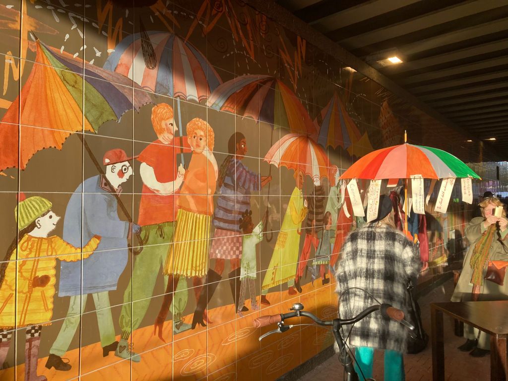 Still, there is hope for the original community to be preserved. People become aware of the beauty that diversity brings to Javastraat. An example of that is a big mural under the viaduct that marks the end of Javastraat and the beginning of Eerste Van Swindenstraat. The mural portrays people from different backgrounds, varying in races, gender expressions, age, and ability. Everyone holds colourful umbrellas and groups together to escape the rain. I remember the mural’s opening a few months ago, on 15 October. Passing by with my bike, I saw people dancing, playing live music and having a potluck dinner. Soon, I found out that the development of the mural was another product of the grassroot network of Javastraat’s community and that its significance is larger than I expected.