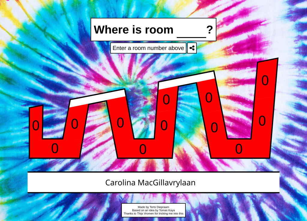 Turning the idea into a tool, however, required more than just humour; after finding a detailed map of the dorms, he matched numbers with floors, buildings, and entrances and manually put it into a big spreadsheet. From there, recalling the coding itself was created within a day: “It was actually quite simple, it was just a lot of typing,” says Diepraam. Although Roomfinder was a simple project for him, Diepraam recounts an argument over whether the current white background could have been a tie-dye image or when he traced the shape of the building from Google Maps: “It is a nice memory, it reminds me how fun it was with my friends,” Diepraam says.
