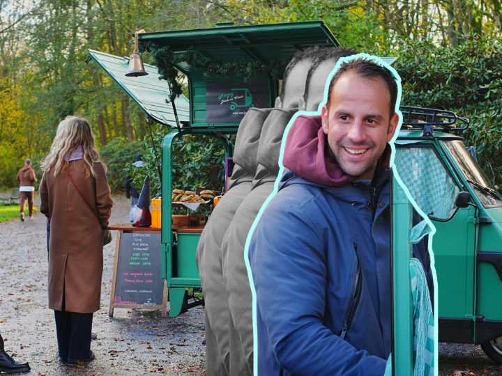 There, standing tall in the cold, tucked behind a small green scooter, is Stavros Moraitis, the owner of Morjoy tuk-tuk cafe located in Flevopark. A small chalkboard is placed next to him, displaying coffee orders and specials offered. Moraitis greets us with a smile from behind the espresso machine as he prepares the orders.